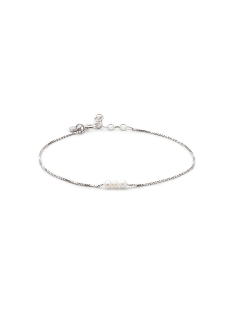 Deze verfijnde schakelarmband heeft drie kleine parels van 3mm in het midden van de armband. deze armband is gesmeed uit sterling zilver en wordt gesloten met een gezekerde veersluiting. een subtiele en klassieke armband, die fijn is om te dragen en gemakkelijk te combineren. verkrijgbaar met een plating van rhodium, 14 kt goud, of rosé goud.