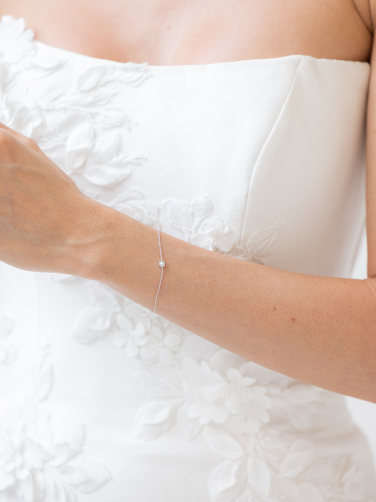 De Leia armband in zilver straalt eenvoud en zachtheid uit. Het fijne bandje met een kleine parel in het midden zorgt voor een frisse en elegante uitstraling. De armband voelt licht aan en sluit mooi aan om de pols. Dankzij het verlengstukje is de armband makkelijk passend te maken. De armband is gemaakt van 925 zilver met een zilverkleurig beschermlaagje en past prachtig bij een lichte, stijlvolle trouwjurk of een andere feestelijke gelegenheid.