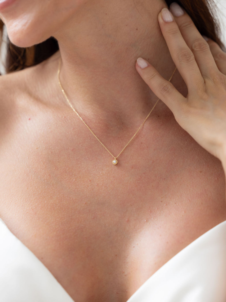 Deze goudkleurige ketting heeft een kleine parelhanger in een fijne, ronde zetting met zirkonia steentjes. Het slanke ontwerp valt mooi in het midden van de hals en vormt een subtiele aanvulling op een elegante trouwjurk. Dankzij de verstelbare lengte is de ketting comfortabel te dragen en gemakkelijk te combineren met bijpassende sieraden.