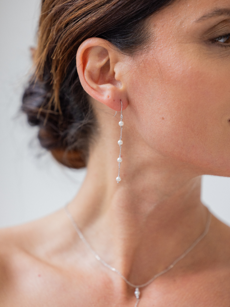 Deze elegante oorbellen hebben een fijne ketting met vier parels die in een rechte lijn onder elkaar hangen. De lichte beweging van de ketting geeft een zachte en sierlijke uitstraling. Het tijdloze ontwerp maakt deze oorbellen zeer geschikt voor een klassieke en romantische trouwlook. Gemaakt van 925 zilver met een zilverkleurig beschermlaagje.