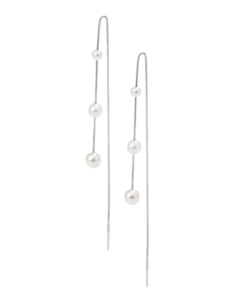 De Maren threaders zijn moderne bruidsoorbellen met drie prachtige parels aan een 925 sterling zilveren box chain met rhodium plating. Deze threader kun je door meerdere piercings dragen voor een unieke look.