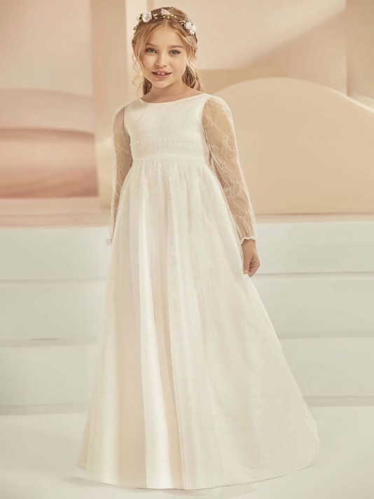 Dit is een prachtige communiejurk gemaakt van kant met prachtige details. Het jurkje heeft een ronde halslijn en doorschijnende mouwen.