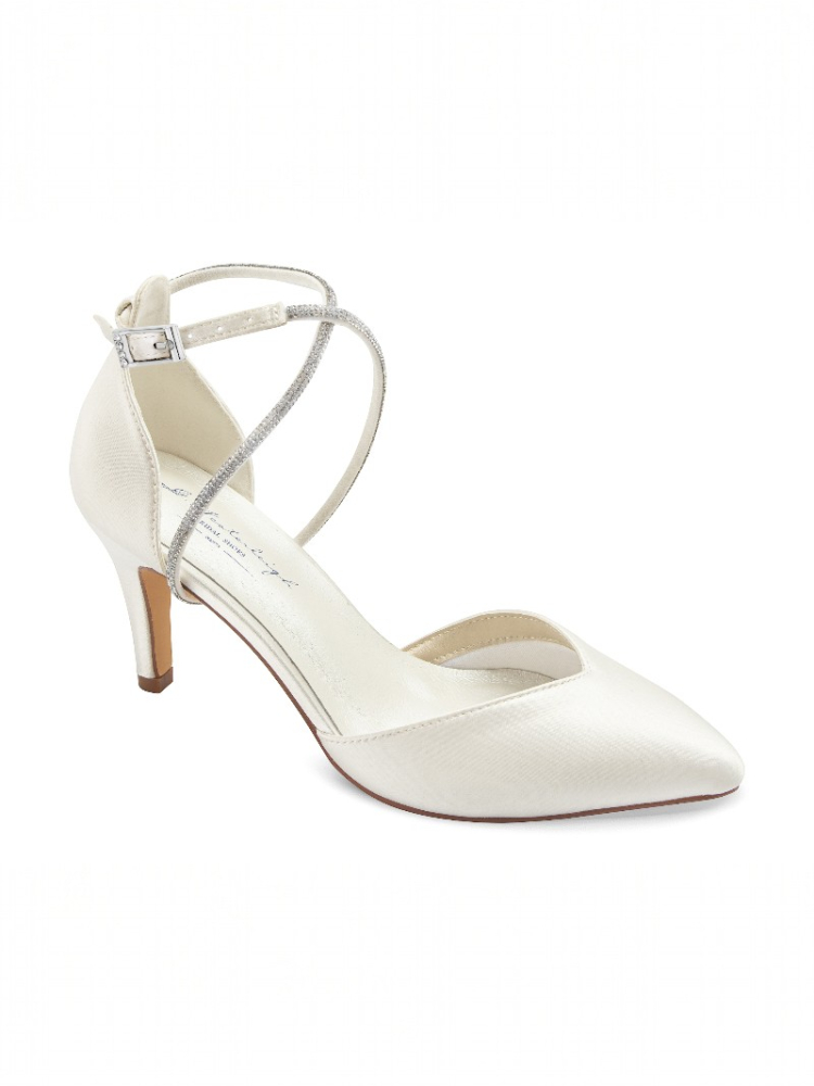 Deze verfijnde Marielle Ivoor bruidsschoen heeft een elegante satijnen spitse neus en een glinsterend bandje dat zorgt voor een romantische uitstraling. De slanke stilettohak van 7,8 cm en de zachte gelvoering bieden prettig comfort tijdens je hele trouwdag. Bij elke paar ontvang je een extra satijnen bandje, zodat je de schoen eenvoudig in meerdere prachtige stijlen kunt dragen.