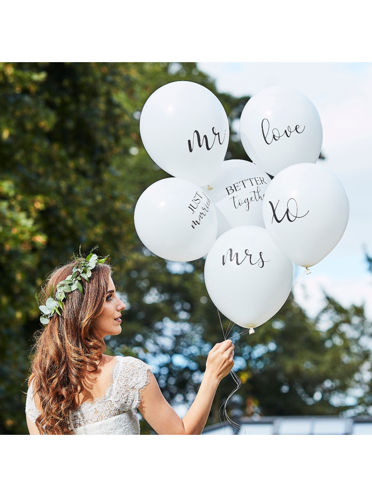 Op de witte ballonnen staan de teksten: Mr, Mrs, Love, XO, Just married en Better Together. De verpakking bevat in totaal 6 stuks, ze kunnen tot een maximale grootte van 30cm worden gevuld met helium of lucht.