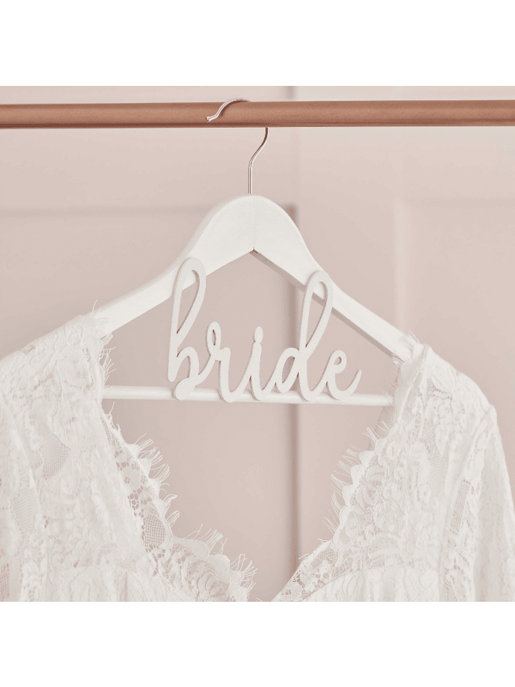 Op je bruiloft draait het allemaal om de finishing touches voor de meest perfecte en magische dag! Maak je in stijl klaar voor je grote dag met deze prachtige Bride kledinghanger. De bruid kan haar jurk eraan ophangen terwijl ze zich klaarmaakt. Bovendien zal deze trouwjurkhanger van wit hout er prachtig uitzien op je trouwfoto's in de ochtend.