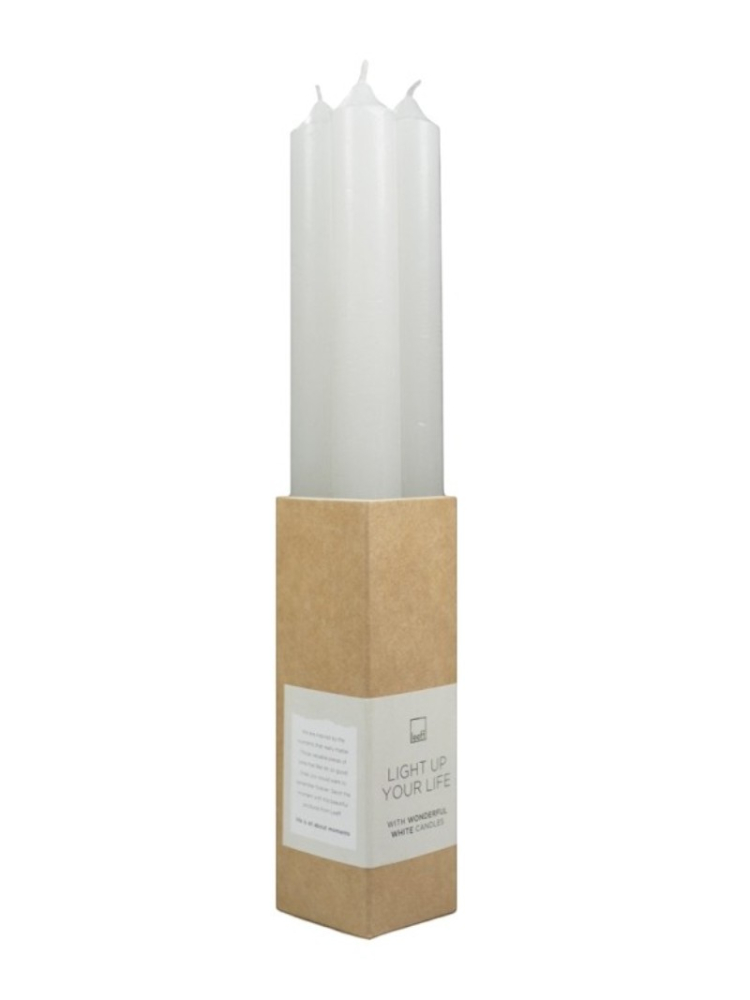 Was kaarsen in zacht wit, 25 x 2 cm, branden ongeveer 10 uur en worden geleverd in een doos met de inscriptie 'Verlicht je leven met prachtige witte kaarsen,' perfect voor rustieke kandelaren en een doordacht trouwcadeau.