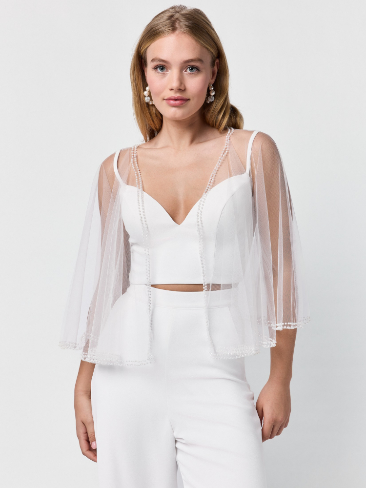 Verfraai je bruidlook met de verfijnde elegantie van de Poirier C-75104 Cape. Gemaakt van delicaat ivoorkleurig tulle, zweeft dit luchtige ontwerp zachtjes over de schouders en creëert het een zachte en romantische silhouet. De cape heeft korte, vloeiende mouwen en is afgewerkt met twee prachtige rijen parels langs de zoom—elke draad voegt een gracieuze textuur en subtiele glans toe.