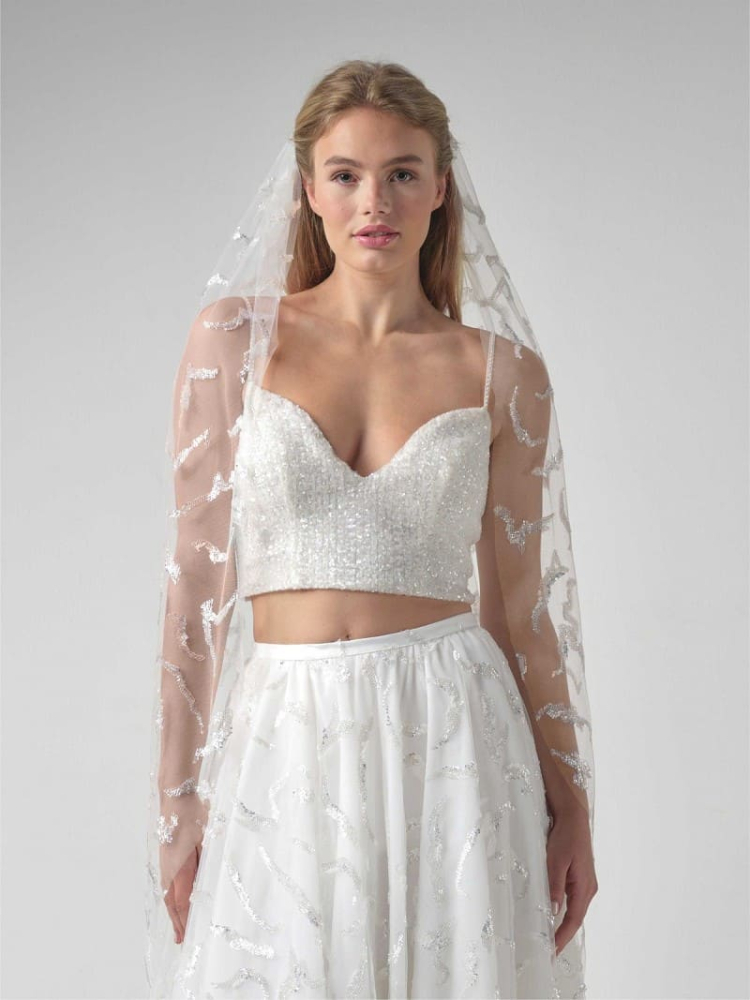 Decoratie: Zilveren pailletten golfvormen over de hele sluier