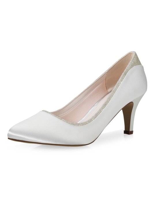 Met de Rainbow Club Jara bruidschoenen straal je stijl uit! Deze ivoorkleurige pumps zijn gemaakt van luxe satijn en voorzien van een sprankelende glitterrand. De elegante trechterhak van 6,5 cm biedt de perfecte combinatie van hoogte en comfort, terwijl de puntige neus een verfijnde uitstraling geeft.