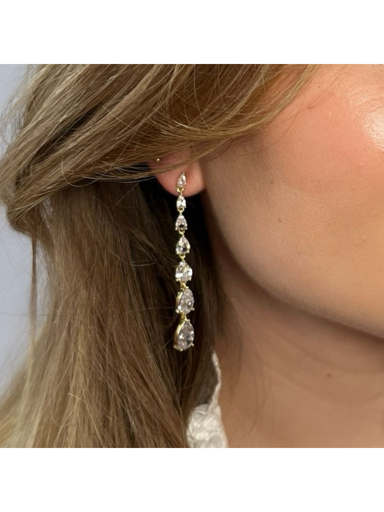 Moderne elegantie ontmoet tijdloze glans met de Ella oorbellen in goud van Sally Jane Bridal. Bezet met vallende zirconia-kristallen en een stralende vergulde finish, flonkeren deze opvallende oorbellen bij elke stap. Een gedurfd maar verfijnd accessoire, perfect om zowel klassieke als hedendaagse bruidslooks compleet te maken.
