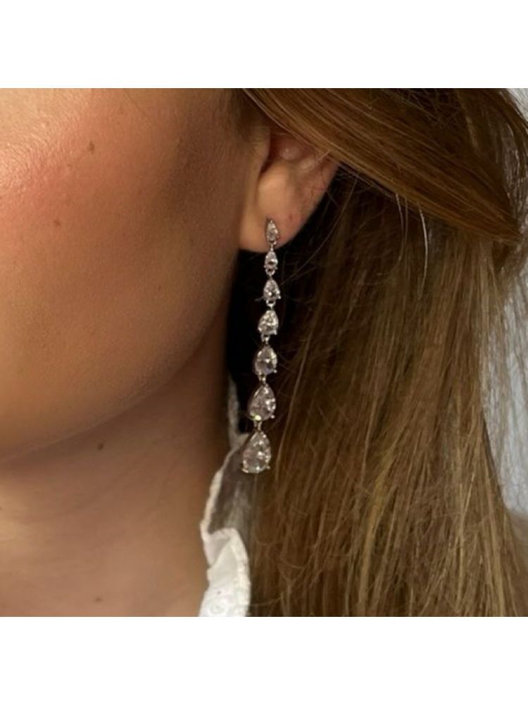 Moderne glamour ontmoet vintage charme met de Ella-oorbellen uit de Sally Jane Bridal-collectie. Bezet met vallende zirkonia in een verfijnd druppelontwerp, schitteren ze bij elke stap en vormen ze de perfecte finishing touch voor iedere bruids- of feestlook.
