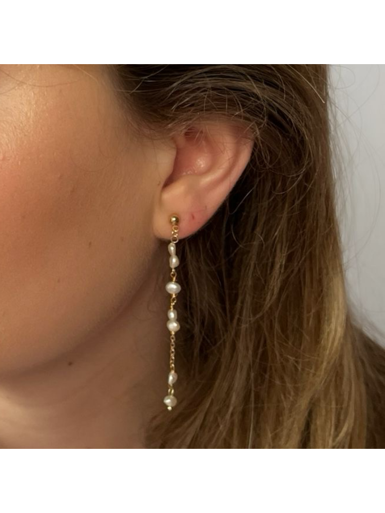 | Verzorgingsinstructies | Stylish gold-plated earrings over brass, delicately finished with sparkling freshwater pearls. These long Mila earrings exude elegance and are perfect for special occasions or as a subtle statement piece. Also available in silver. |